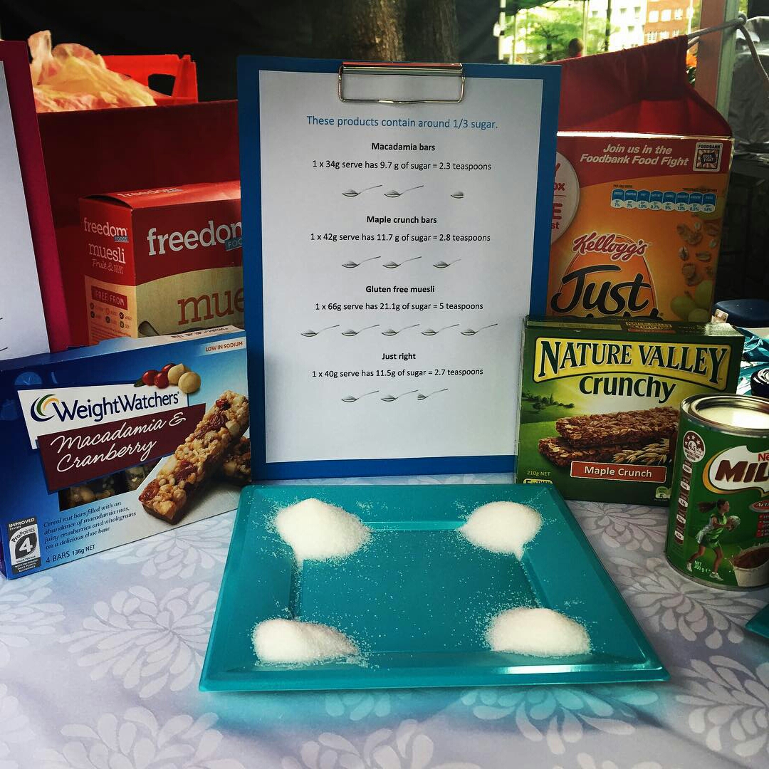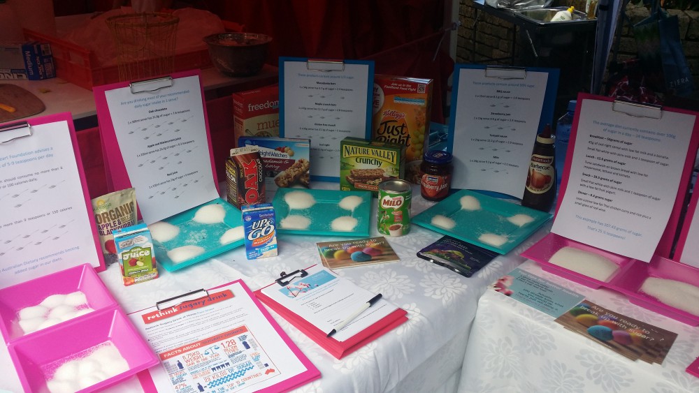 This month is sugar free September, and there has been a lot of great awareness in the media this month. Jamie Oliver’s “Sugar Rush” was on channel ten, “The sugar conspiracy” and “Is sugar the new fat” on SBS and community viewings of “That sugar film”. A lot of people we talked to on Saturday were aware of the hidden sugars in packet foods, but a huge number of people were not. It’s great to be part of the message and help build awareness in the community.